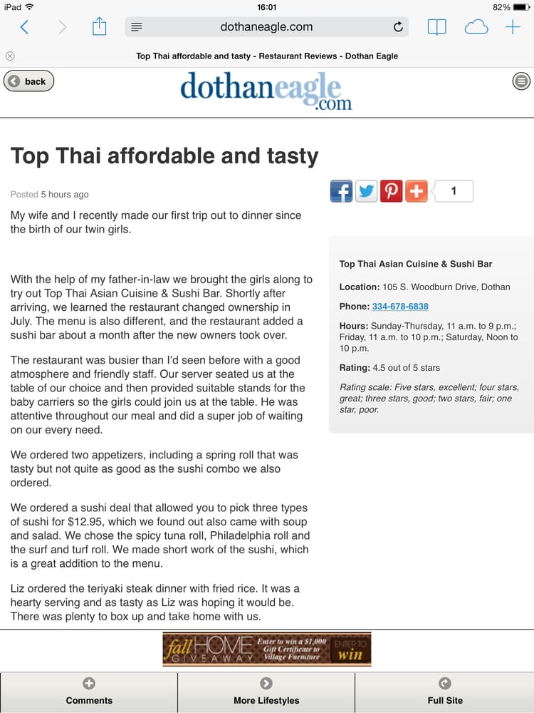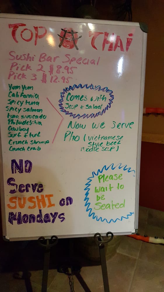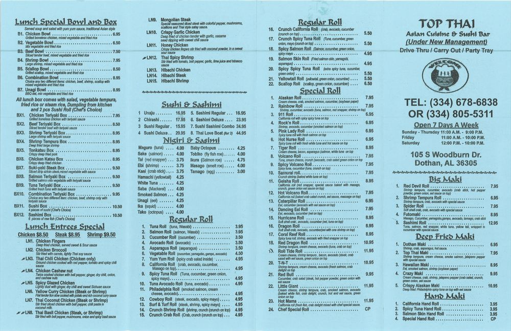 Introducing the menu at Top Thai, a Thai-Asian fusion restaurant located in Dothan, AL. This classy establishment offers a wide range of options including sushi appetizers like Sashimi and Tuna Tataki, regular maki rolls such as Tuna and Salmon, and special rolls like Red Dragon and Coral Reef. The menu also boasts many vegetarian choices and caters to groups, kids, and even offers catering services. Customers rave about the fresh, top-notch food and excellent service, with reviews highlighting dishes like Lettuce Wraps and Drunken Noodles. With a full bar, outdoor seating, and free Wi-Fi, Top Thai is a must-visit for anyone craving delicious and authentic Thai cuisine. Visit Top Thai and experience a culinary journey that will leave you coming back for more.